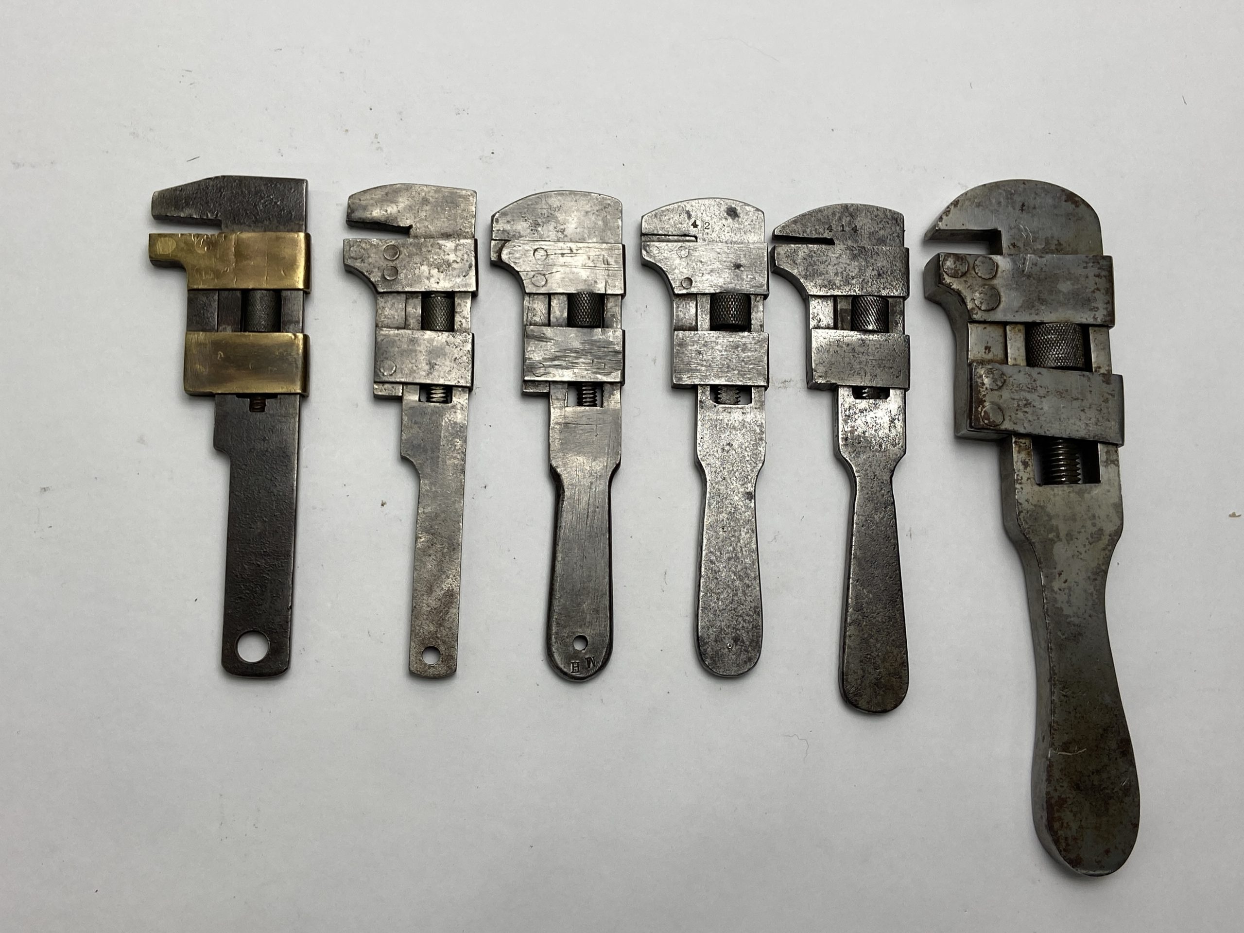 MVWC Wrench Showcase Unidentified Quick Adjust Combination Monkey Pipe Wrench Collection of New Rapid Open End Bicycle Wrenches Type Study Collection of Craftsman made Screw Adjust Nut Wrenches S.G. Co. No. 1 Buggy Wrench